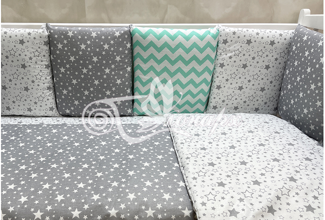 Бортик составной: 12 подушек 31х34 см на замочках упакованы в сумку-переноску.