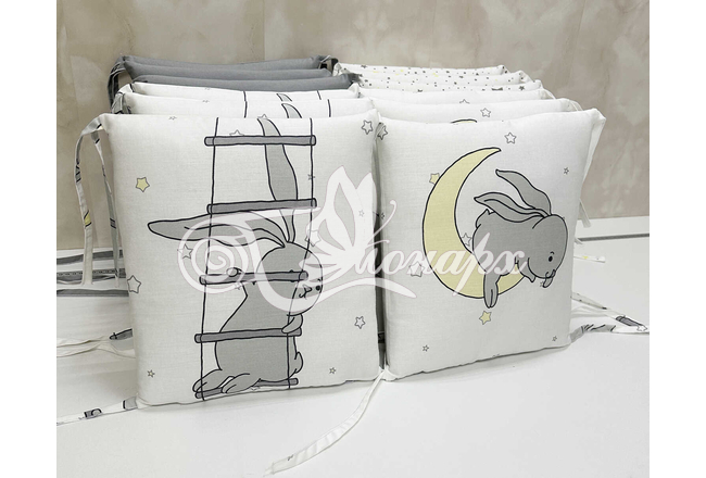 Бортик составной: 12 подушек 31х34 см на замочках упакованы в сумку-переноску.