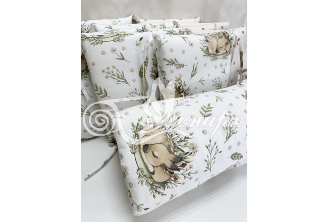 Бортик составной: 12 подушек 31х34 см на замочках упакованы в сумку-переноску.
