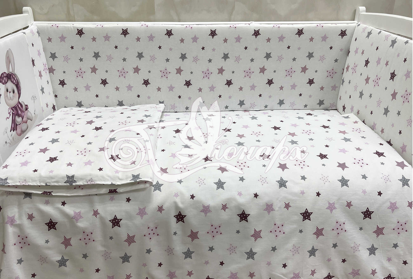 Бортики СО СЪЕМНЫМИ ЧЕХЛАМИ в кроватку: защитят Вашего малыша от ушибов, сквозняков, солнечных лучей и не дадут малышу запутаться в прутьях кроватки. - Простыня на резинке 60х120 см (подходит для стандартной кроватки)