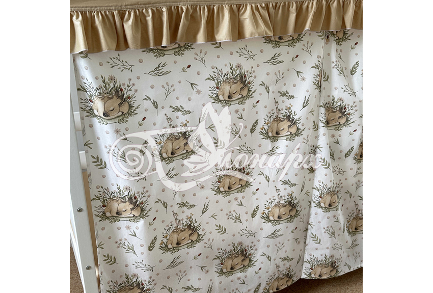 ширина - 137 см + 24 см на рюши (по 12 см на одну сторону). - Занавески с завязками (по 4 завязки на каждой занавеске) на переднюю сторону кроватки 2 шт.: